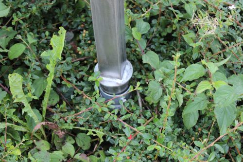Edelstahlschilderhalter aus Edelstahl mit Schraubanker im Erdreich befestigt und drehbar. Beschriftung im Plot auf Edelstahlplatte.